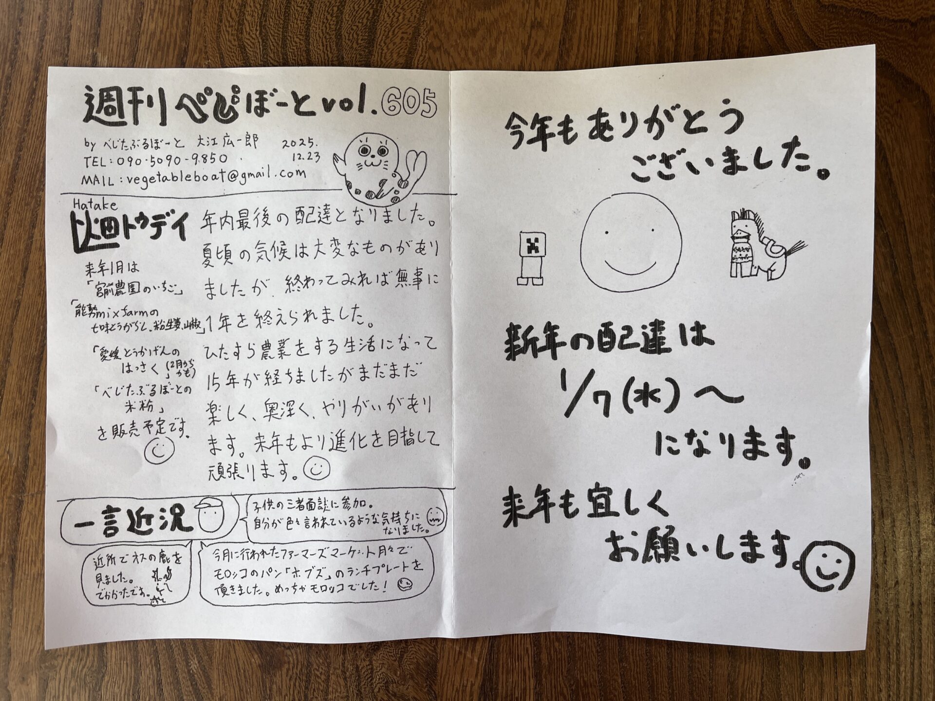 近くにどんな人がいて、どんな想いをもって、どんな活動をされているか。地域内循環に意識を向けていたいと思います。べじたぶるぼーとの大江さんと年末の挨拶をして、引き続き、来年も美味しいお野菜を楽しみに待つことができること自体が平和で幸せだなと思ったクリスマスでした。