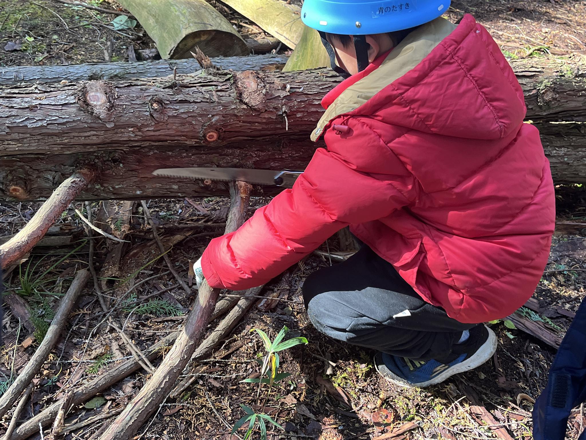 小さな子どもたちが夢中になって木を切っている姿。足裏で感じる森の感触、光が差した森の景色、みんなで力を合わせ木を倒す体験、自分で枝を切り落とした達成感、身体で覚える道具の使い方、地元のおじさんたちの道具使いを子どもたちはどう見ていたでしょう。そして、目の前の木から物ができることを知ります。