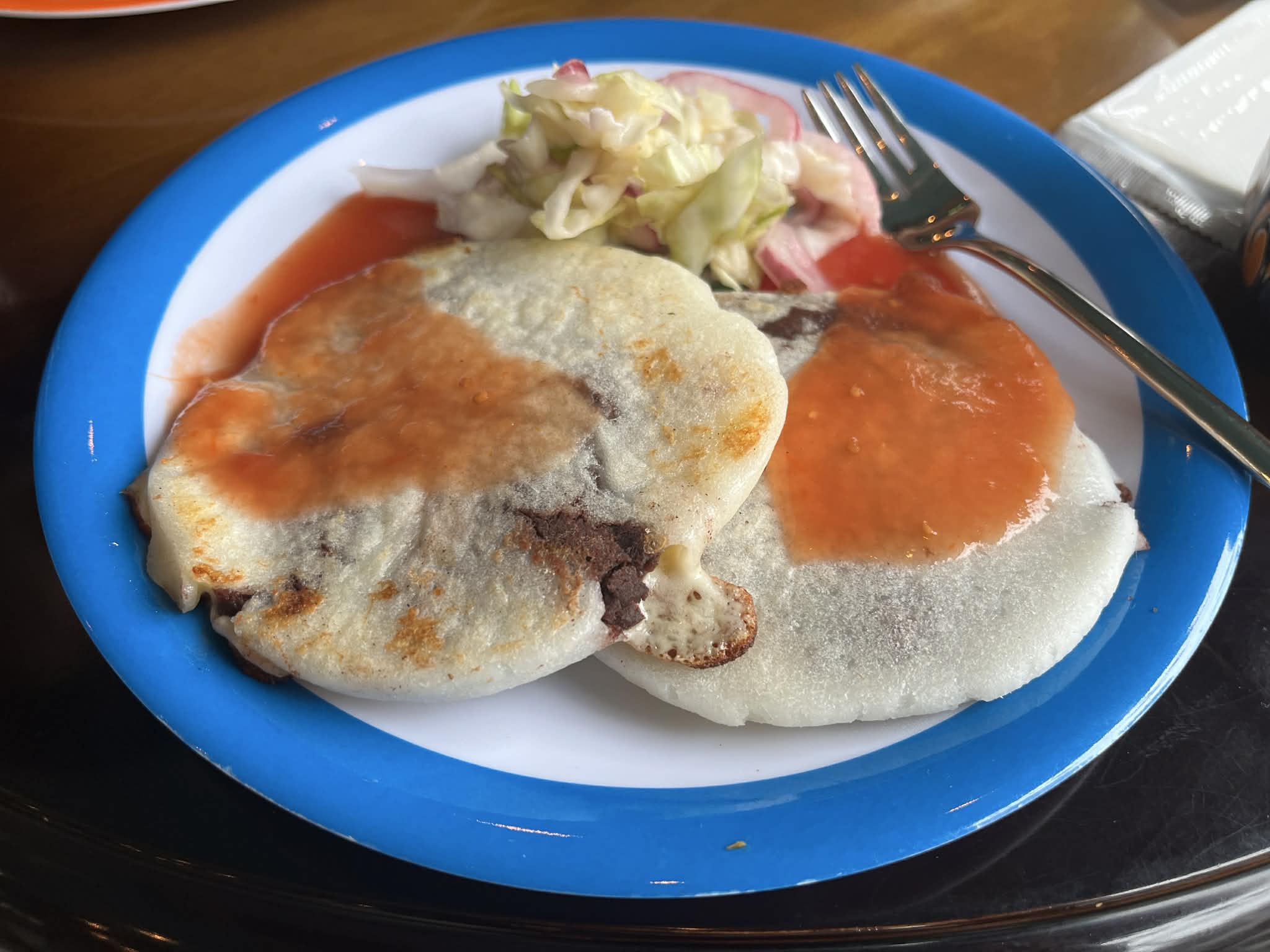 次に向かったのは、中米産コーヒー専門店「カフェテナンゴ」。前職はカフェオーナーをされていたご主人おすすめのお店です。コーヒー通も満足できるコーヒーがいただけるのはもちろん、めずらしい南米・エルサルバドル料理のププサ(トウモロコシから作られた生地に、豆のペーストやチーズ、肉など具材を包み平にして焼いた料理)もいただきました。店内はラテンの雰囲気が楽しげです。