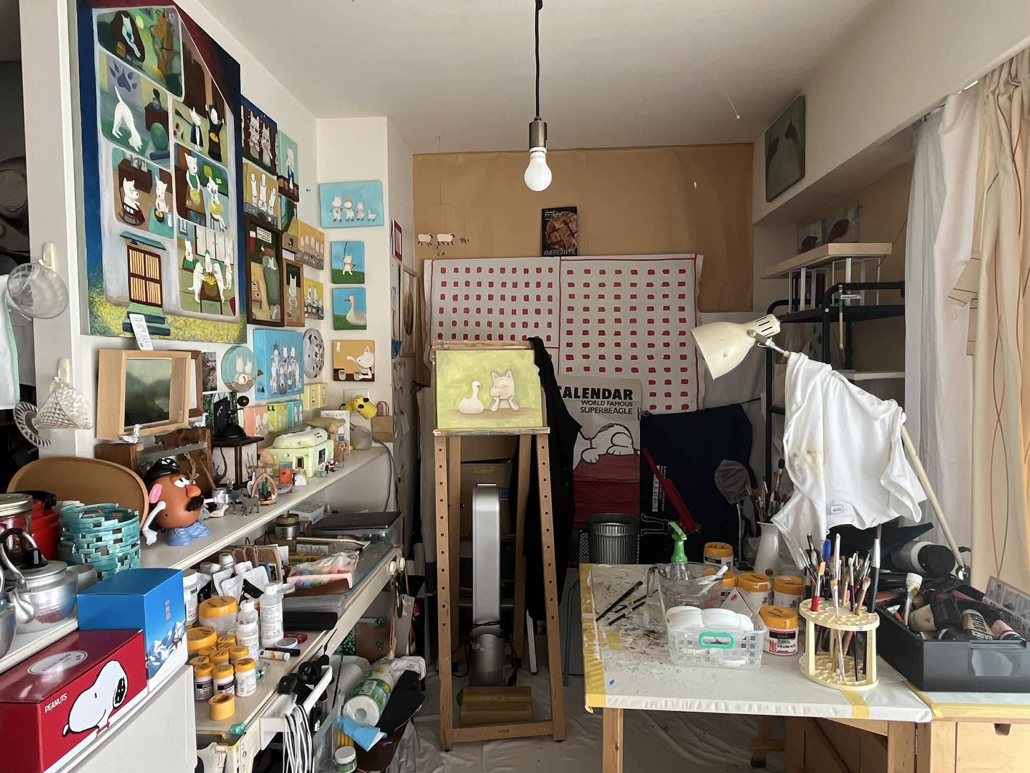 ご自宅にもたくさん飾られていた奥様の作品。中でも「白い犬シリーズ」は、「白い犬は犬ではなく私たちそのもの」のようです。