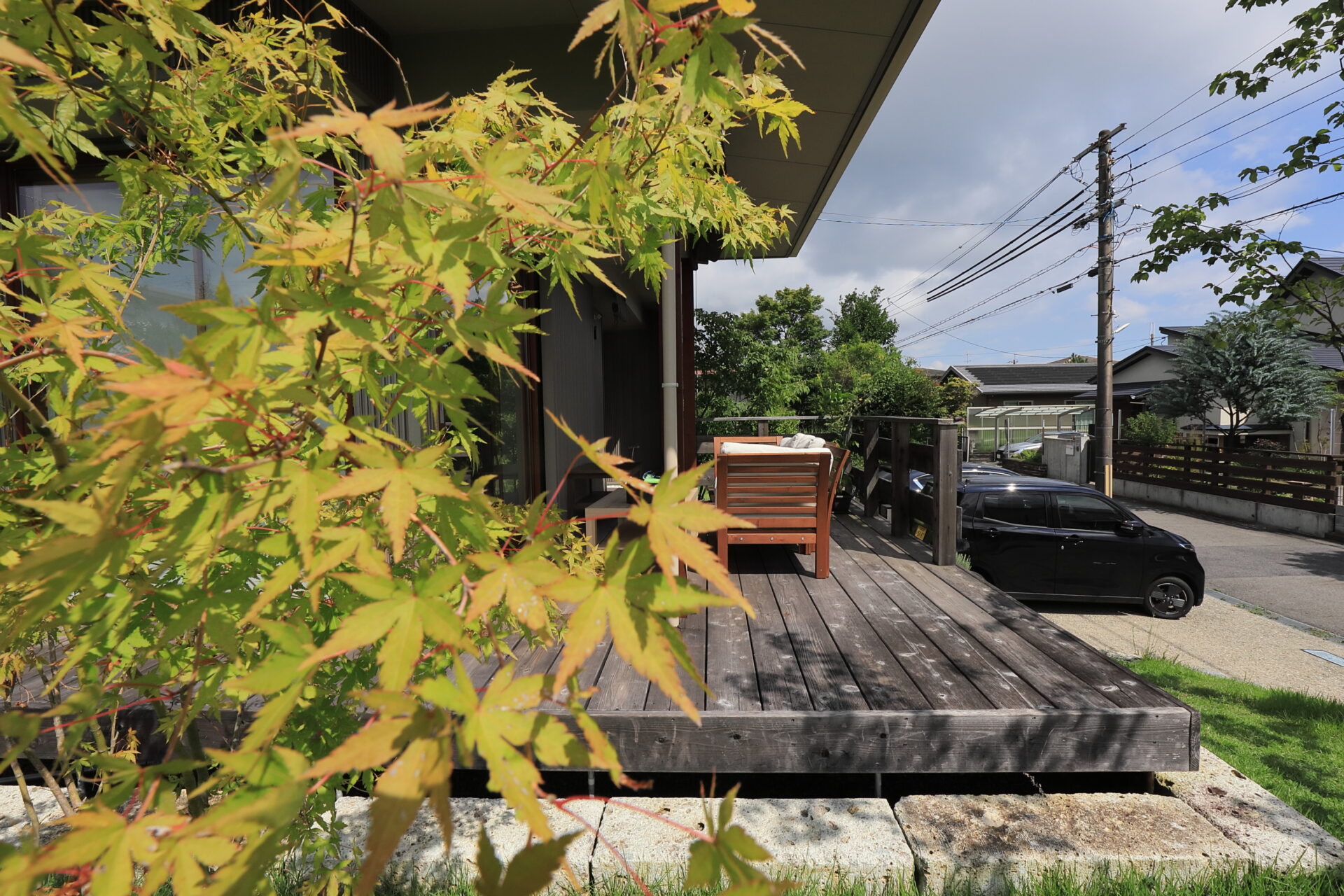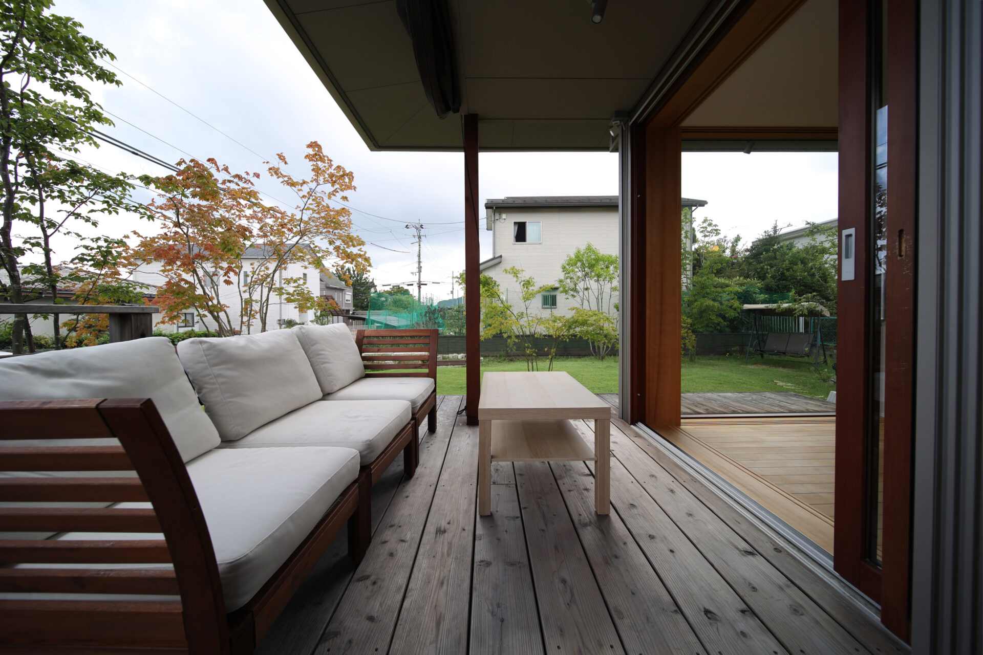 手摺に囲まれ、屋根のかかったこの場所は、雨に濡れることなく過ごせる外部の居間です。