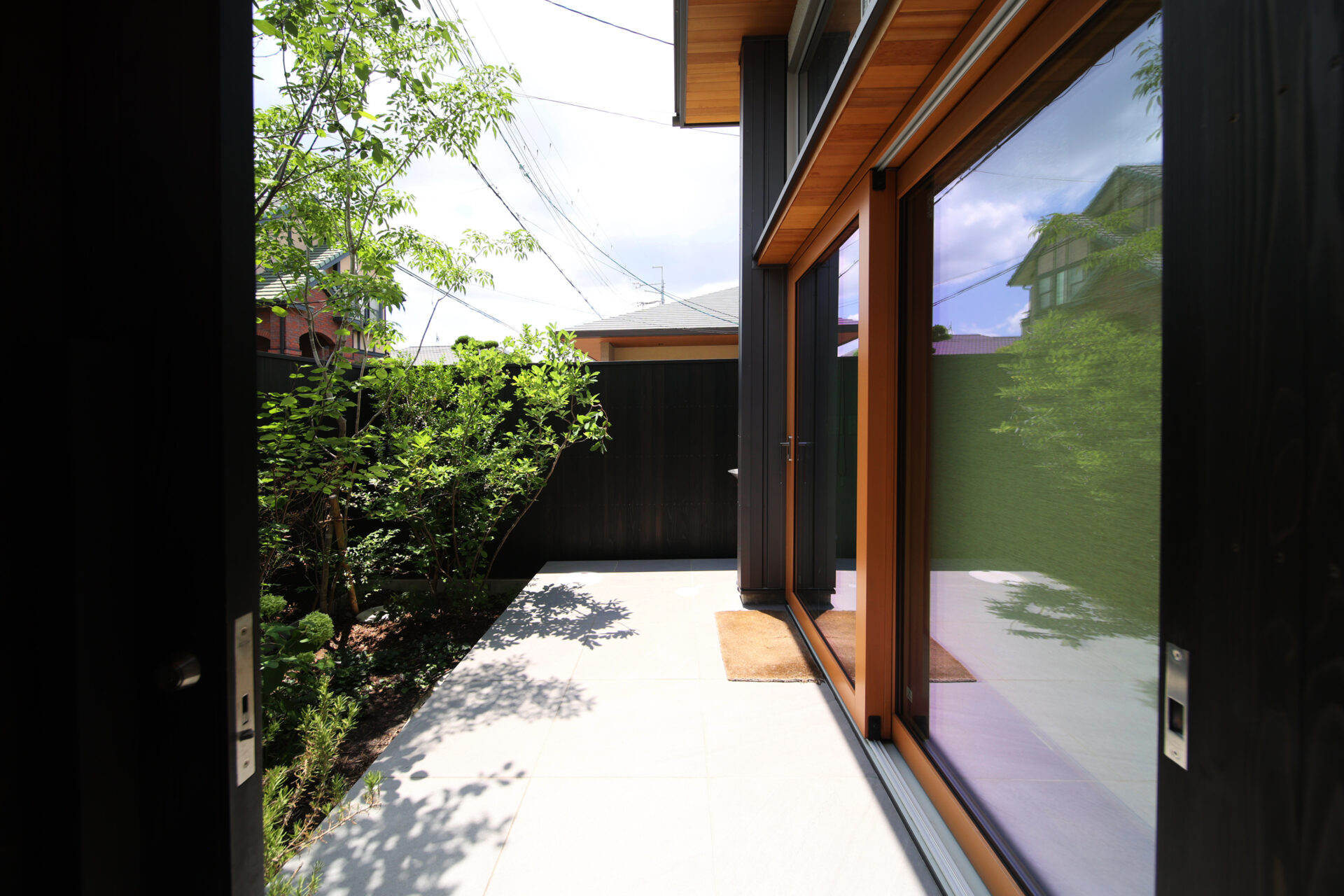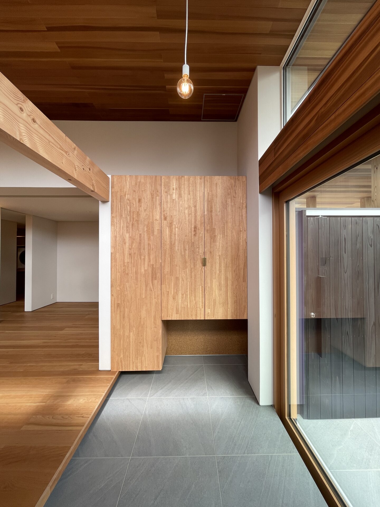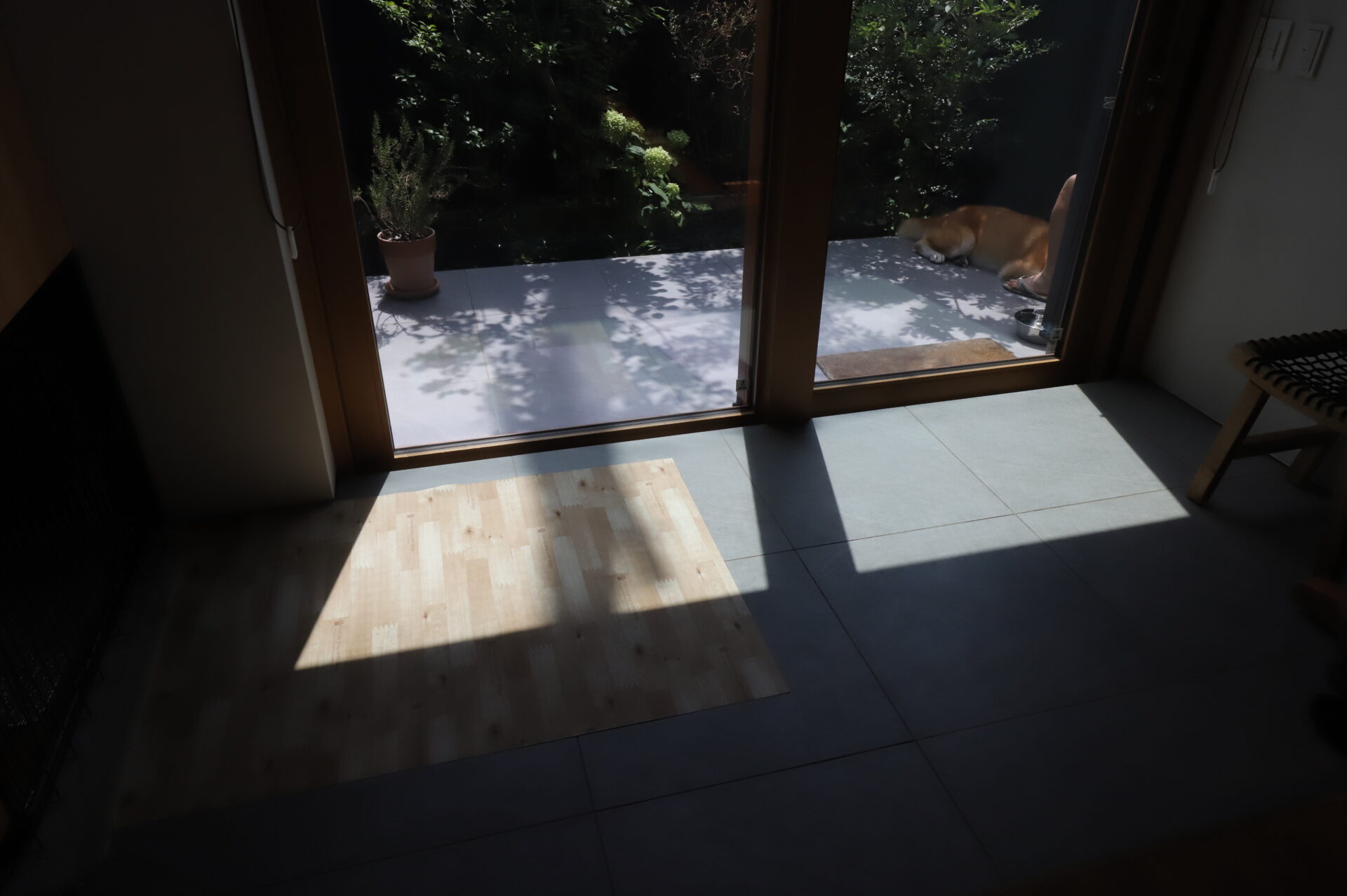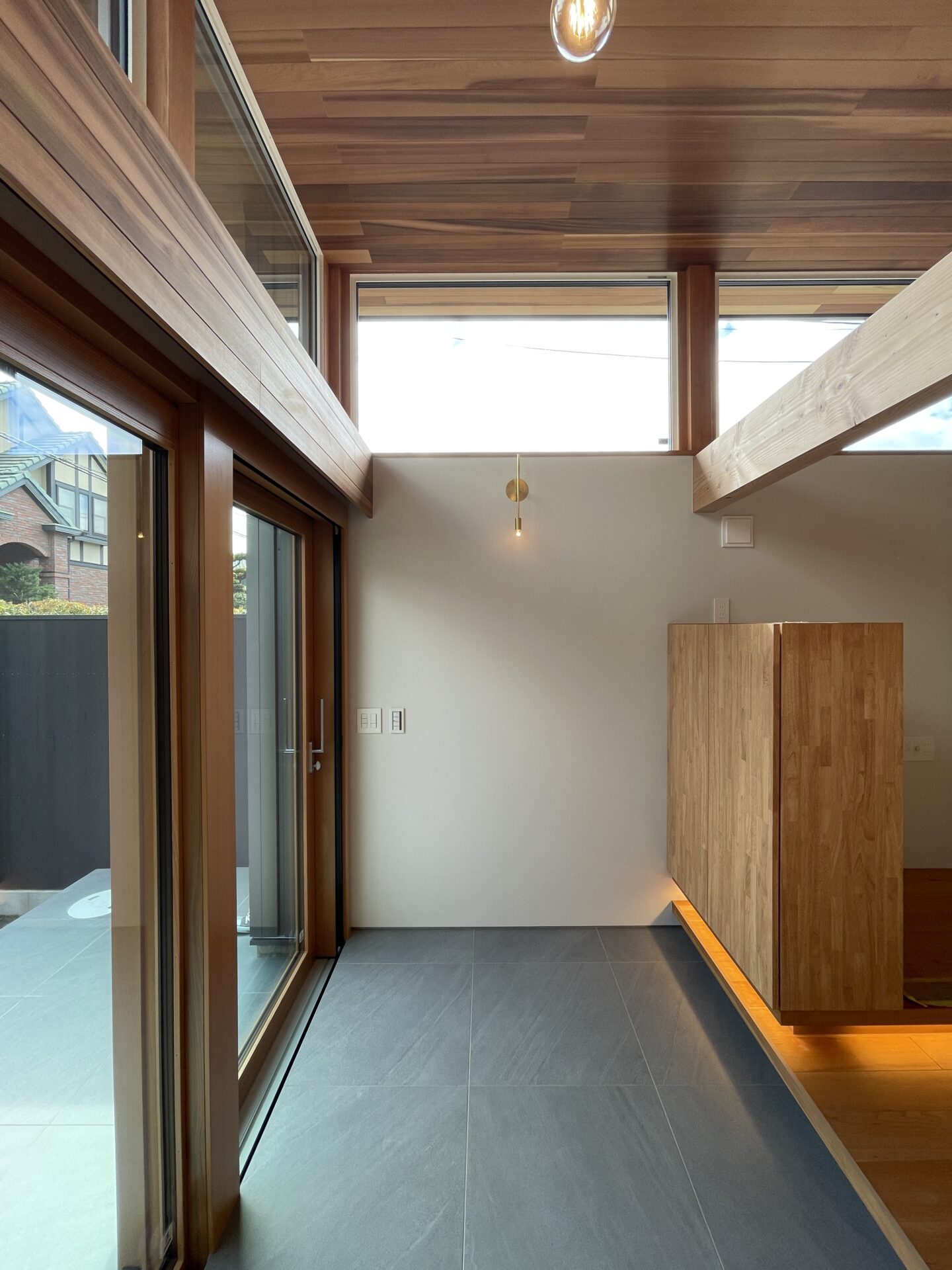 庭との程よい距離感、内と外がつながる場、中間領域となる土間玄関は、1日2回の散歩が必須の犬との暮らしに欠かせない場として使われています。室内から玄関を通して緑が見え季節の変化や時間のうつろいを感じ、暮らしに潤いをもたらしてくれます。