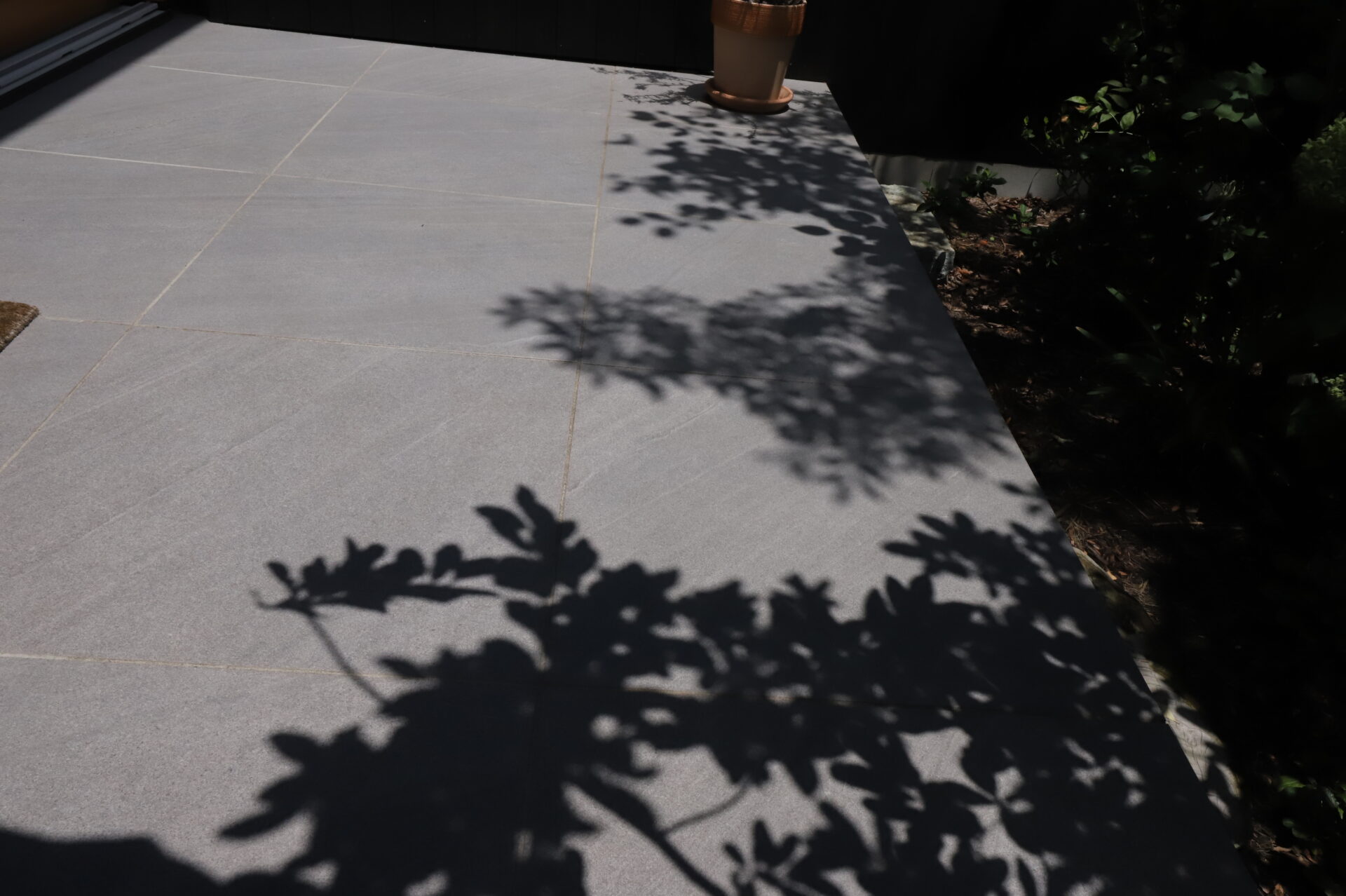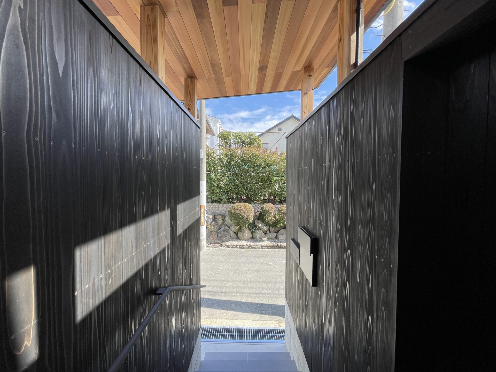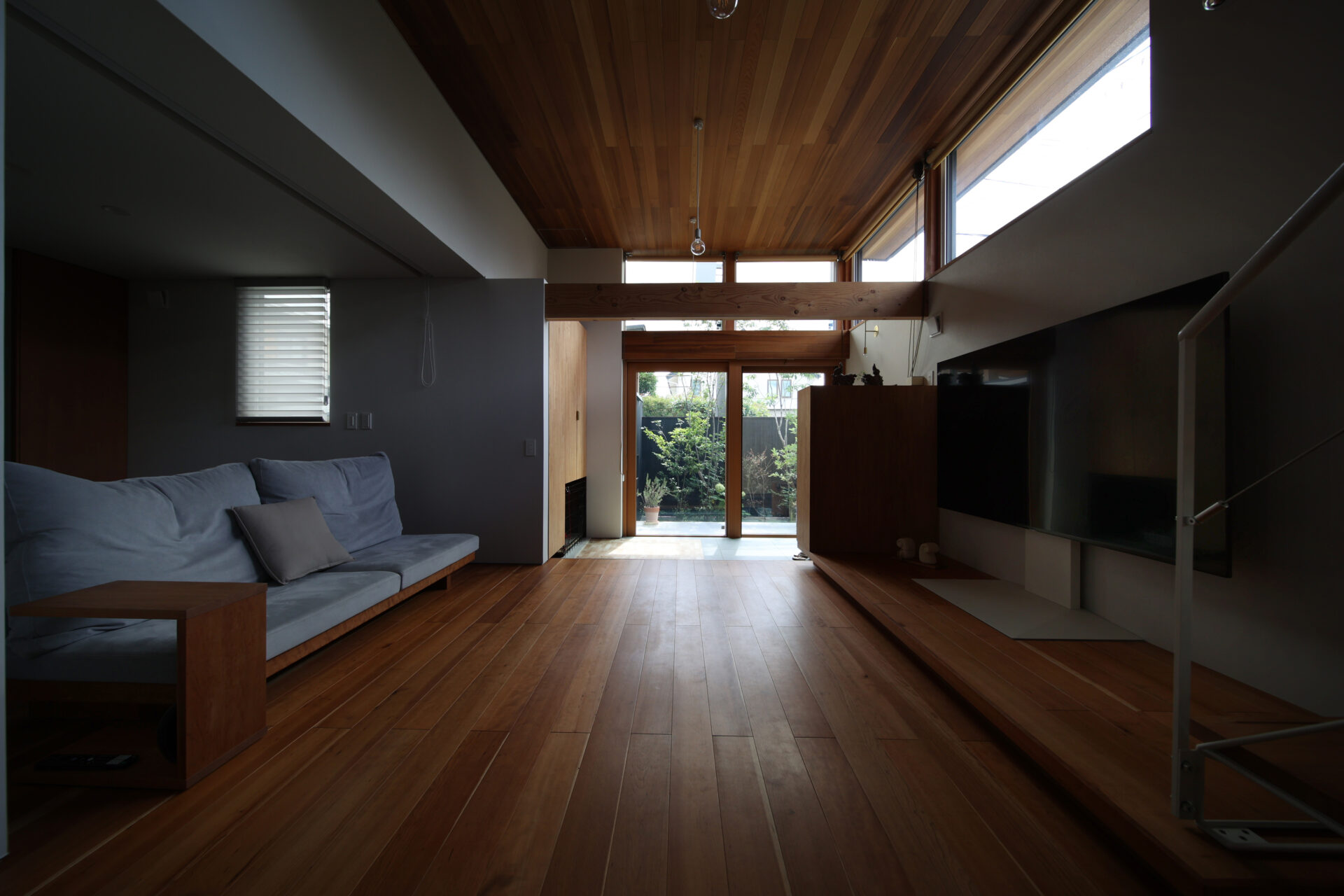 住まい手から視線が気になることをお聞きしていたこともあり、周囲の視線を気にせず暮らせるコートハウスのような塀をつくる計画に、道路から敷地地盤面が60cm程度高くなっていることが視線の切り方に有利に働いています。住宅地において、周囲からの視線を気にすることなく景色を楽しめる安心感は居心地のよさにつながると思います。