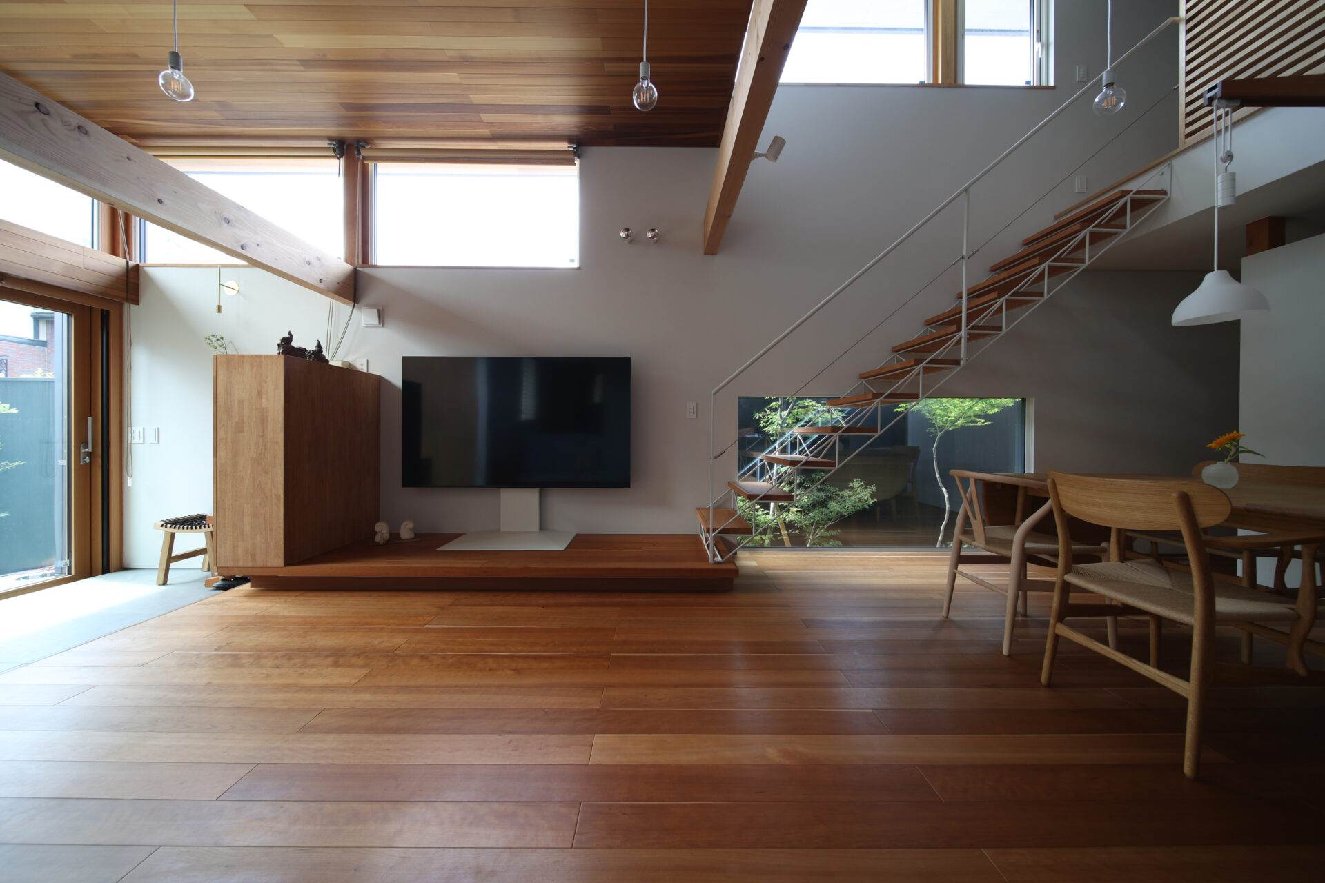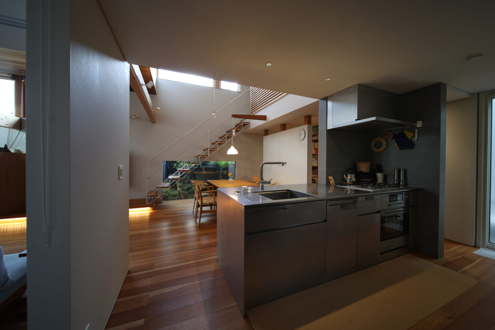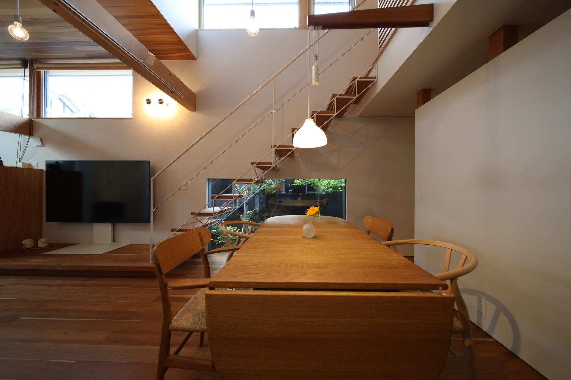 敷地の特徴:東道路、南隣接地は西側住宅の専用通路で更に通路の南隣地建物は平屋で近年建て替えられており、採光上は非常に有利な敷地です。冬至日における周囲の建物の日影シミュレーションでは建物を北側に寄せた東西に長い建物とし、南面開口部から日射取得するのがエネルギー効率が良い結果となります。この場合、採光が均一になりどの部屋にいても同じ環境が得られます。しかし、日射取得だけではない自然光の経時変化を空間に取り入れるには居場所の変化が鍵となります。また、前面道路の電柱問題もあり、北側に駐車場、東南側に庭を配置し、周囲は適材適所に植栽を施す方針とし、南面の大きな吹抜から内部に日射取得できる平面断面計画としました。 夏至日は各階の庇を出すことにより冷房負荷となる日射を遮蔽しています。
