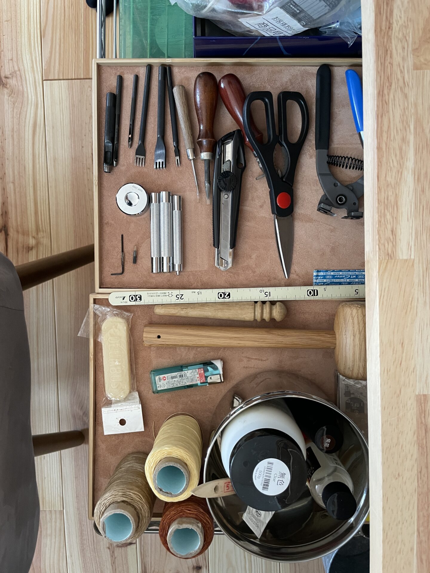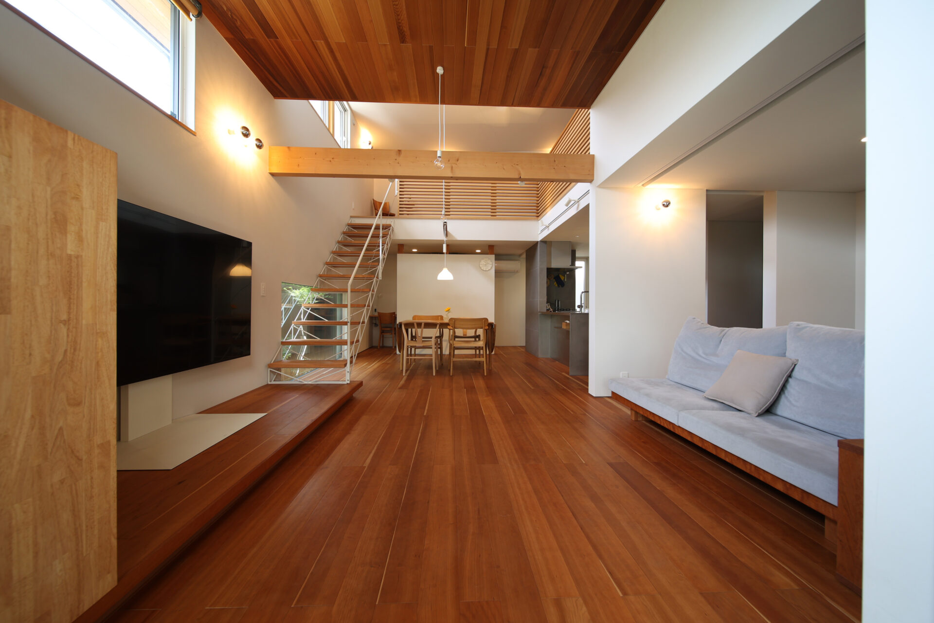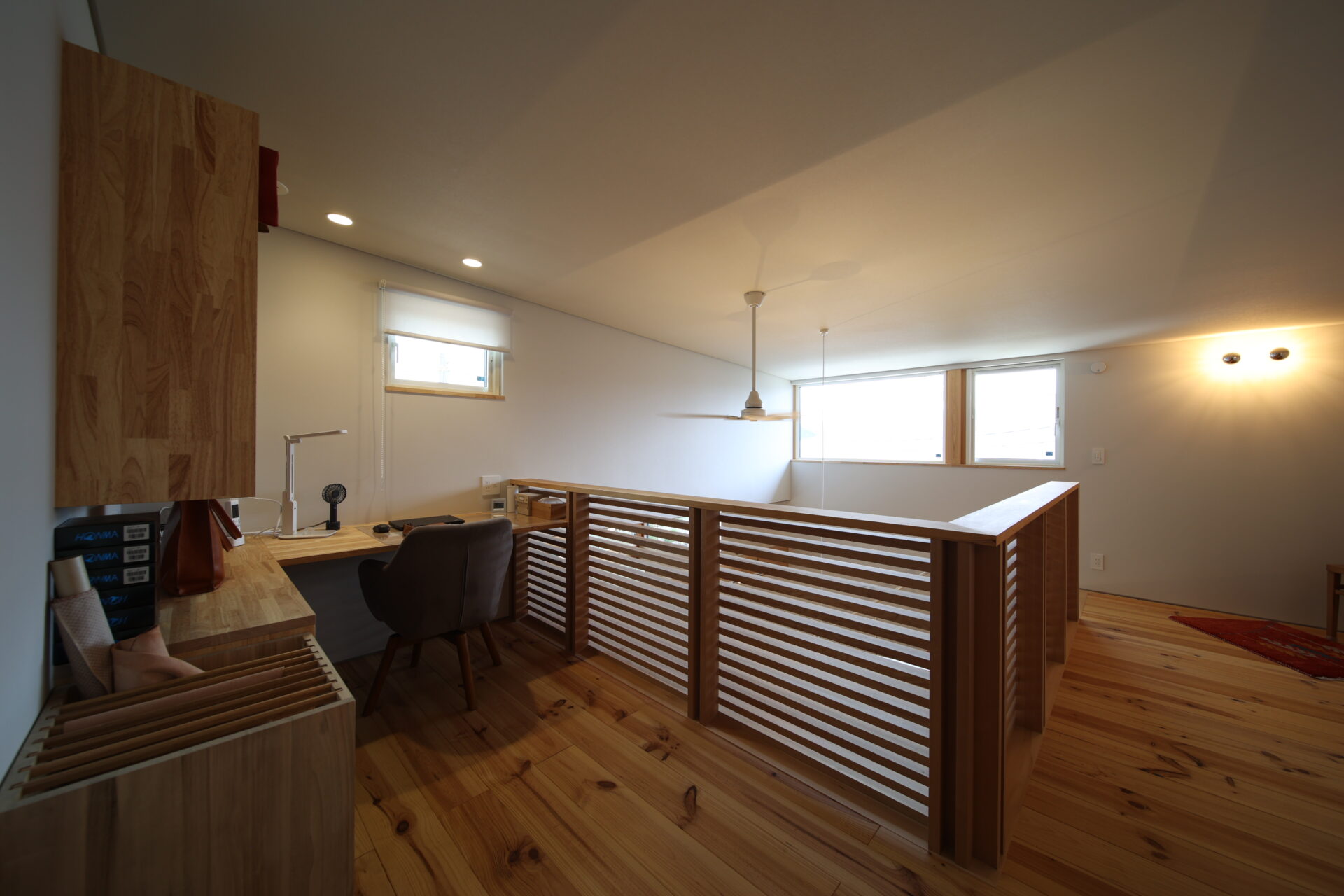 階段上のコーナーは読書の場となり、2階ホールに位置するレザークラフトのスペースは趣味に没頭する場です。あえて個室にすることなく吹き抜けとつながりを持たせています。部屋の機能を固定しない流動的な空間とスペースの割り当てが、今後の変化への備えとなっています。1階だけで暮らす可能性、2階に個室をつくる可能性を持たせています。